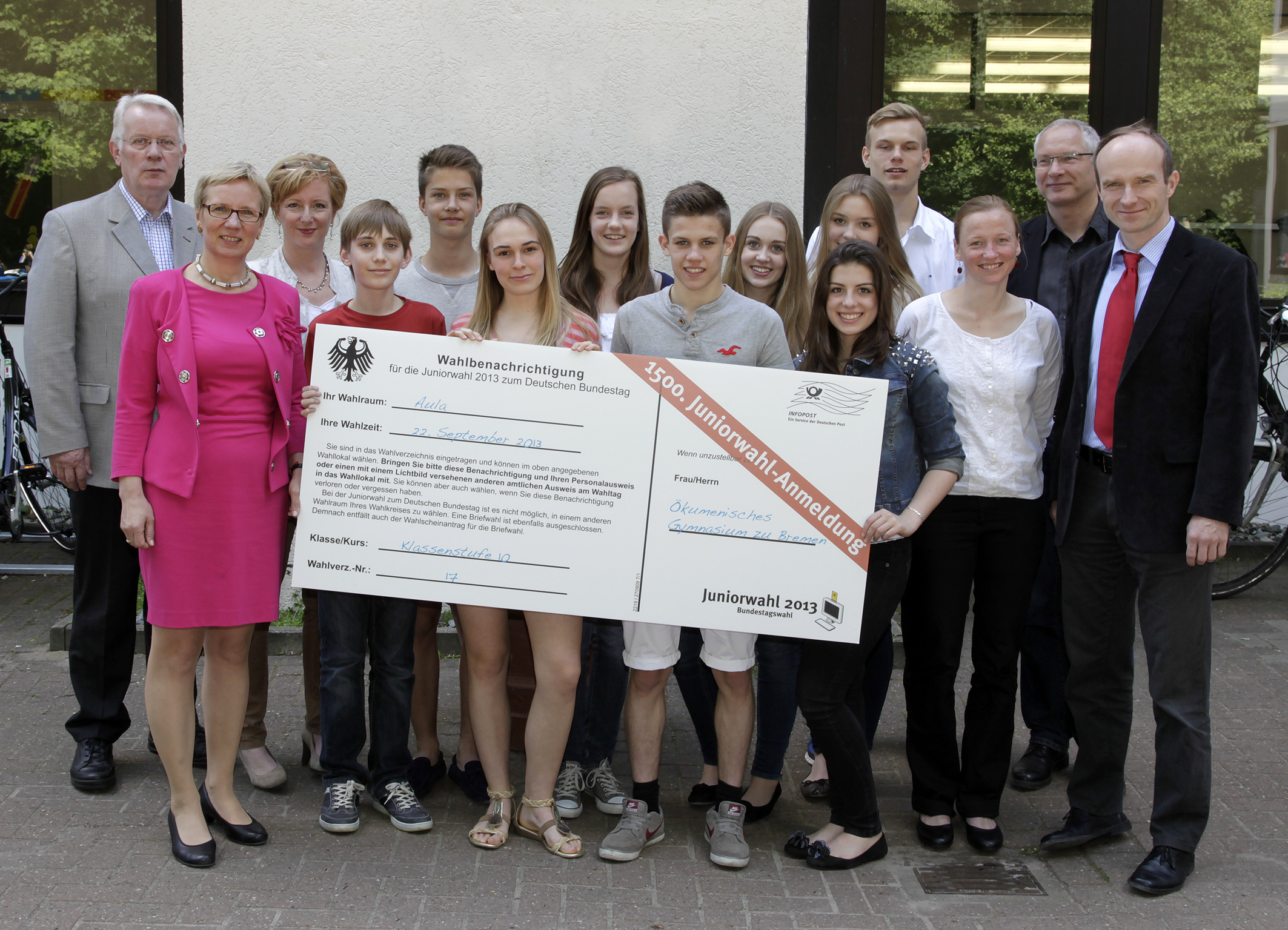 Bereits mehr als 1500 weiterführende Schulen haben sich zur Teilnahme an der Juniorwahl 2013 parallel zur Bundestagswahl angemeldet. Das ist neuer Juniorwahl-Rekord! Die 1500. Anmeldung kam vom Ökumenischen Gymnasium zu Bremen. Prof. Dr. Eva Quante-Brandt, Senatorin für Bildung und Wissenschaft der Freien Hansestadt Bremen, hat heute der Schule eine XXL-Wahlbenachrichtung zur Bundestagswahl 2013 überreicht. Im Rahmen der Juniorwahl werden sich die Schülerinnen und Schüler im Unterricht intensiv mit dem Thema “Wahlen und Demokratie” auseinandersetzen und anschließend im Vorfeld der Bundestagswahl selbst einen Wahlakt durchführen.